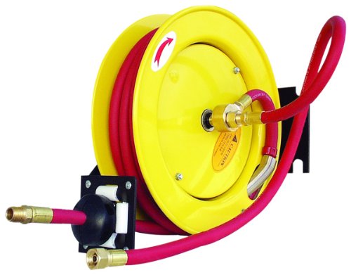 Amflo automatic open hose reels feature a spring-wound auto-rewind mechanism and a locking ratchet brake. Mounts on wall, floor or ceiling. Guide arm is adjustable to dispense hose at various angles. Includes 3/8 inch x 50 foot 250 PSI red rubber air hose with 1/4 inch MNPT and 1/4 inch FNPT fittings.