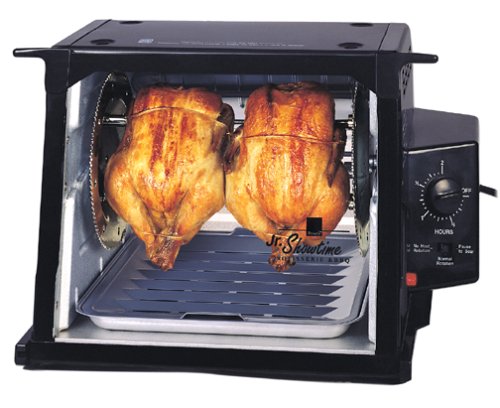 I don't ordinarily buy things I see on TV infomercials, but my husband bought the Showtime Rotisserie for Christmas this year and it's the best kitchen appliance we've purchased! Everything we have made in it comes out tasting fantastic. We've done game hens, chicken, fish, roast beef, pork and ribs in it, and everything is absolutely delicious! Clean-up is easy, especially if you cover the drip tray in aluminum foil. The only part that is impossible to clean is behind the heating element. I wish they would make it removable.Everything cooks much faster than in a conventional oven, and you use less marinade and basting sauces than you would in a conventional oven or BBQ grill. The Junior is the perfect size for 1 or 2 people. Buy the black, as the white has discolored a bit from the heat.You can quiet the noise referred to in a previous review by placing a drop or two of cooking oil on the gears inside the oven, and where the spit rests (the factory told us this).